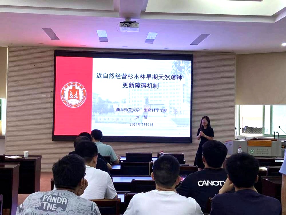 刘博教授针对杉木林这一重要的人工林类型,在近自然经营过程中所遭遇的早期天然落种更新障碍进行了阐述。系统阐明了光照和光质、机械阻碍、化感作用等因素对林下种子更新的影响机制,并分享了栓皮栎种子更新在未来全球气候变化背景下的研究价值。