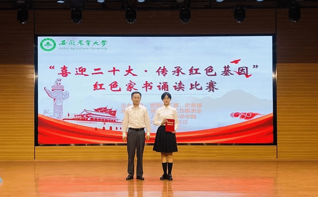 9月22日,我院学子22中林张子恒,22园林邵瑜婉,22城规窦成功,22林学吴睿妍在安徽农业大学“喜迎二十大·传承红色基因”红色家书诵读比赛中喜获一等奖。