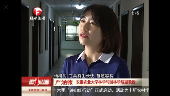 2020年5月25日,林学系教工党支部青年党员严涵薇副教授出现在安徽电视台经济生活频道第一时间栏目上,为广大市民科普他们极其关心的杨树飞絮现象。严涵薇副教授详细介绍了包括更换树种、修剪枝条、洒水落絮、注射药剂在内的杨树飞絮治理方法。她同时向大家科普了杨树本身具有重要的生态价值和经济价值。杨树具有生长快、适应性强、繁殖容易,木材产量高的优点,从经济效益上来说杨树是速生丰产用材林;而在城市中的杨树,能起到抑制浮尘、净化空气、减低噪声、美化环境的作用,有巨大的生态价值。