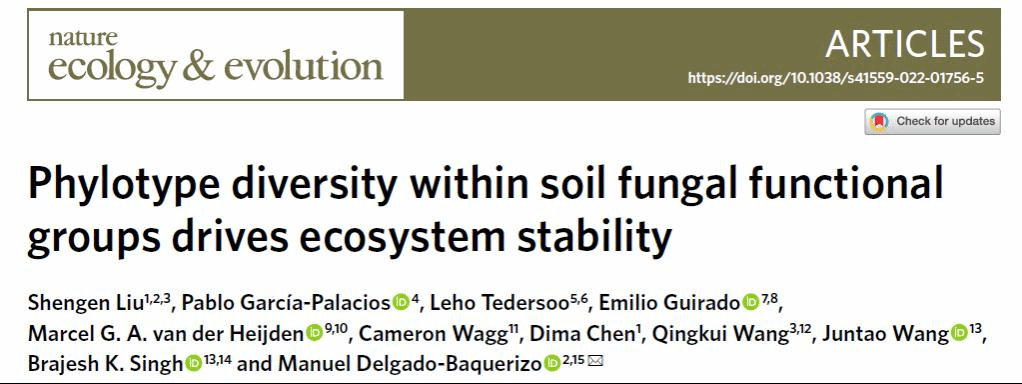 该研究成果以题目“Phylotype diversity within soil fungal functional groups drives ecosystem stability”发表在Nature子刊Nature Ecology & Evolution(2020年IF = 15.460)上