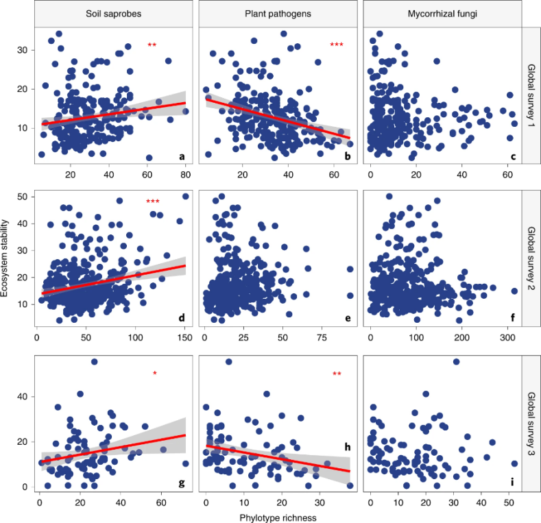 针对这一重要的科学问题,安徽农业大学王清奎团队作为合作者和其博士毕业研究生刘圣恩博士联合西班牙塞维利亚自然资源和农业生物研究所、中科院沈阳应用生态研究所等全球15个研究机构开展了三条独立的全球尺度的土壤调查,包括森林,沙漠,草地等10种不同陆地生态系统,覆盖全球673个不同地点,利用二代和三代测序定量了土壤真菌不同功能类群的多样性。在此基础上深入探讨真菌多样性与2001-2018年间对应地点的植物生产力稳定性之间的联系。结果显示:独立于植物,土壤真菌多样性在植物生产力稳定性上发挥着重要的作用,并且这种作用与真菌功能类群的生态策略密切相关,即土壤腐生真菌多样性越高的系统,植物生产力的稳定性越高,而植物真菌病原体多样性越高的系统,植物生产力在时间尺度上越容易出现较大的波动,这一现象在全球草地生态系统中尤为明显。在全球变暖更容易导致植物真菌病原体大爆发的背景下,该研究成果为预测未来气候变化引起的真菌病原体的增长所导致的植物生产力的波动提供了重要理论支持。