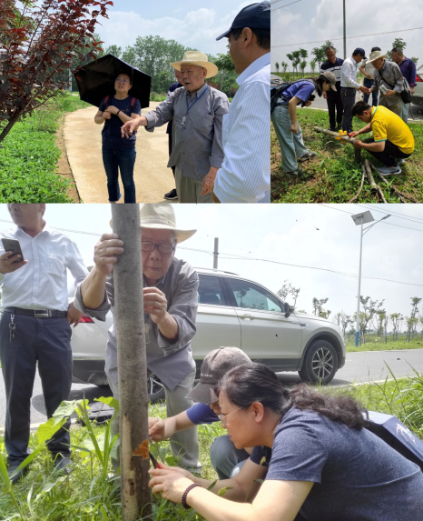 2020年6月24日,应肥东林业局森防站邀请,林学系退休教授杨春材带领林学系教工党支部青年教师王士娟副教授和顾天滋博士一同前往肥东县古城镇,解决当地紫叶李虫害和行道树臭椿大面积死亡问题。经过现场仔细勘查,杨春材教授指出,紫叶李叶片是被金龟子成虫危害,因其昼伏夜出特性,故难以发现,可于傍晚落日后施药。臭椿出现死亡是臭椿沟眶象所致,目前为成虫期,可施用绿色威雷药剂进行防治。