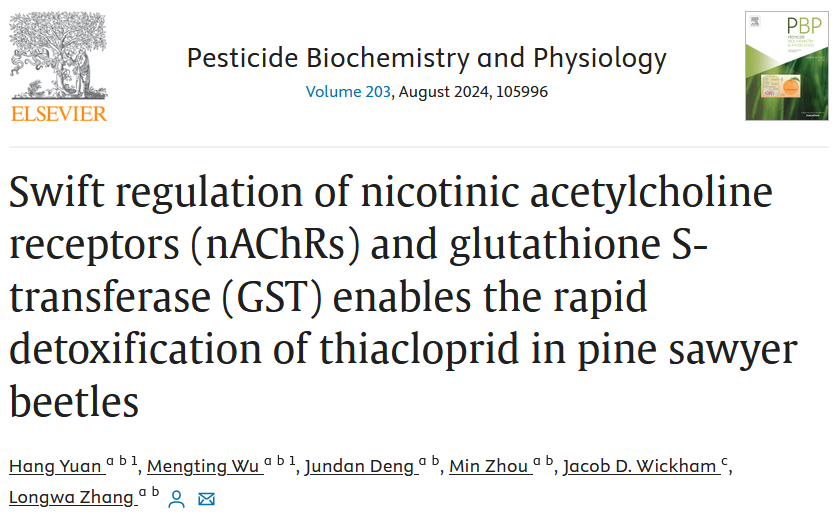 近日,我校林学与园林学院林木资源培育安徽省重点实验室、重大林业有害生物绿色防控安徽省重点实验室张龙娃教授在《Pesticide Biochemistry and Physiology》(IF=4.7,中科院一区TOP期刊)发表在重大林业害虫松墨天牛对噻虫嗪解毒机制方面的最新研究论文,题目为“Swift regulation of nicotinic acetylcholine receptors (nAChRs) and glutathione S-transferase (GST) enables the rapid detoxification of thiacloprid in pine sawyer beetles”。