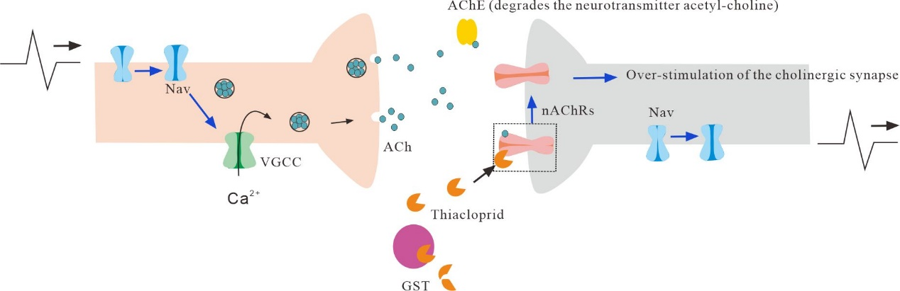 松墨天牛是松树的重要蛀干害虫,也是重大林业病害松材线虫病的主要传播媒介昆虫,他们对林木健康和生态系统稳定造成了严重威胁。新烟碱类杀虫剂噻虫啉具有广谱、高效、低毒和低残留等优点,对松墨天牛具有良好的触杀、胃毒及内吸活性,但是昆虫可以通过改变其生理、生化及行为等方式,对杀虫剂产生解毒与适应,关于松墨天牛对噻虫啉解毒和适应性机制的研究尚无相关报道。通过毒力测定、转录组测序、酶活分析、RNA干扰以及分子对接等研究手段,研究人员明确了松墨天牛谷胱甘肽-S-转移酶(Glutathione S-transferase,GST)在提高松墨天牛对噻虫啉解毒能力方面的重要功能。与此同时,松墨天牛还可以通过提高乙酰胆碱酯酶(Acetylcholinesterase,AChE)的活力,同时降低烟碱型乙酰胆碱受体(nicotinic acetylcholine receptors,nAChR)的表达量来缓解噻虫啉引发的过度神经冲动。